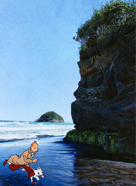 Tintin and Snowy at Backbeach New Plymouth Graham Kirk, 2026 acrylic on board 1340mm x 970mm email Graham at grahamdavidkirk@gmail.com