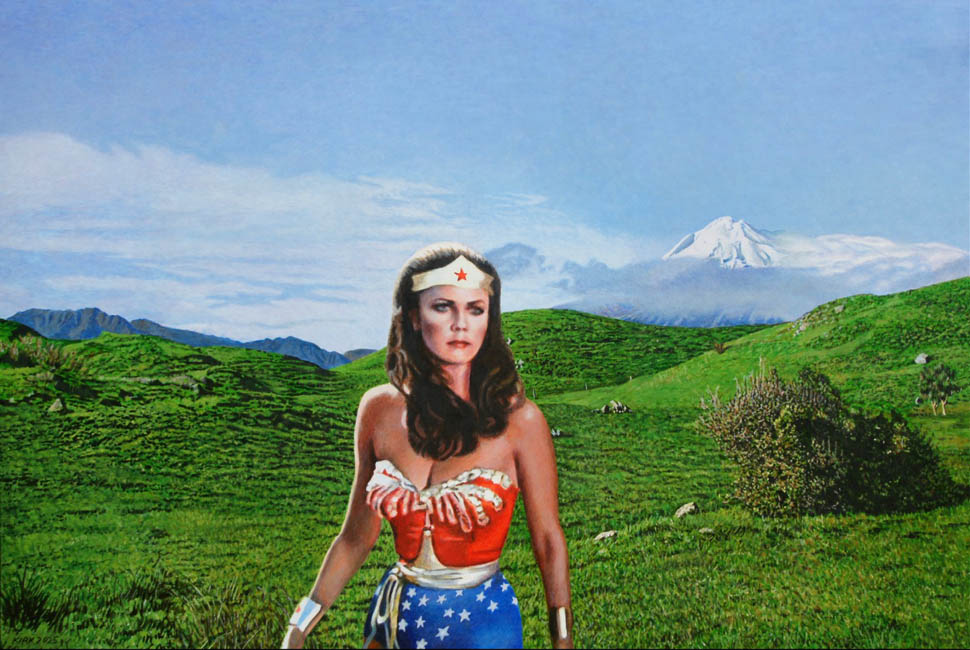 Wonderwoman in Taranaki New Plymouth Graham Kirk, 2025 acrylic on board 810 x 1220 mm email Graham at grahamdavidkirk@gmail.com