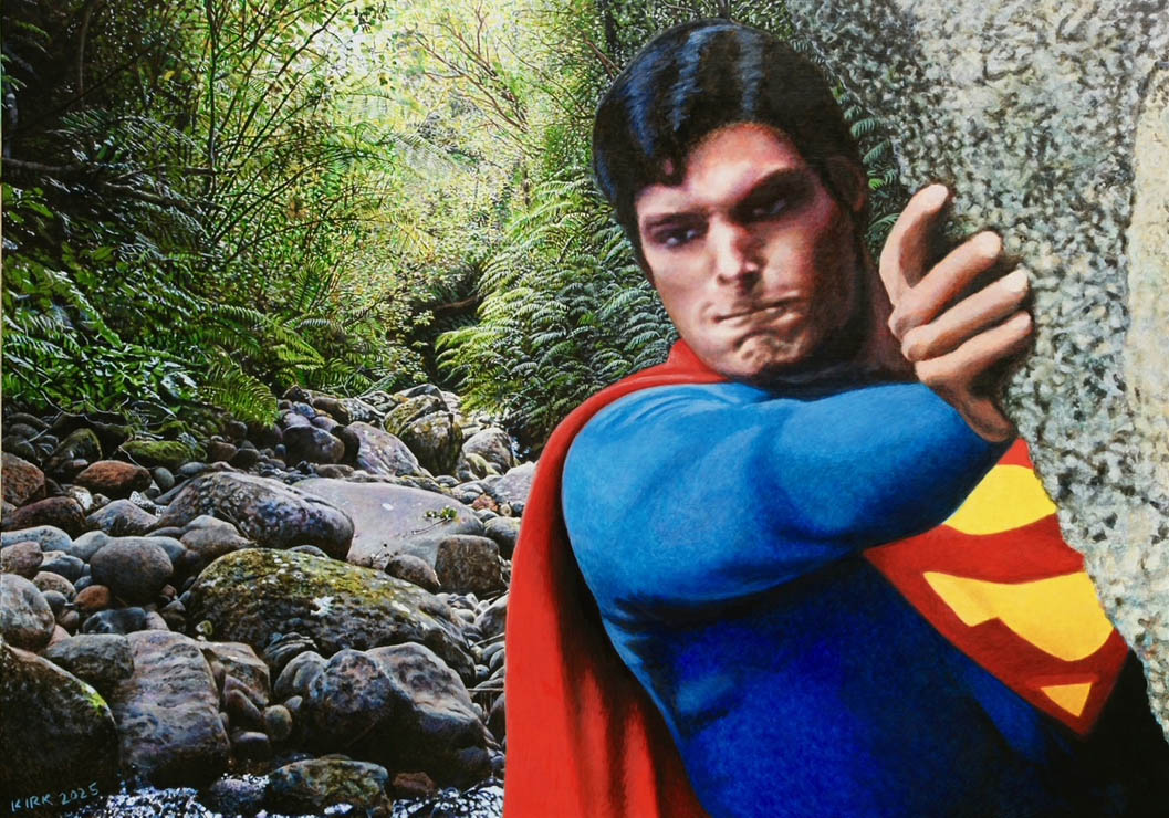 Superman and the Katikara Stream New Plymouth Graham Kirk, 2025 acrylic on board 870 x 1200 mm email Graham at grahamdavidkirk@gmail.com
