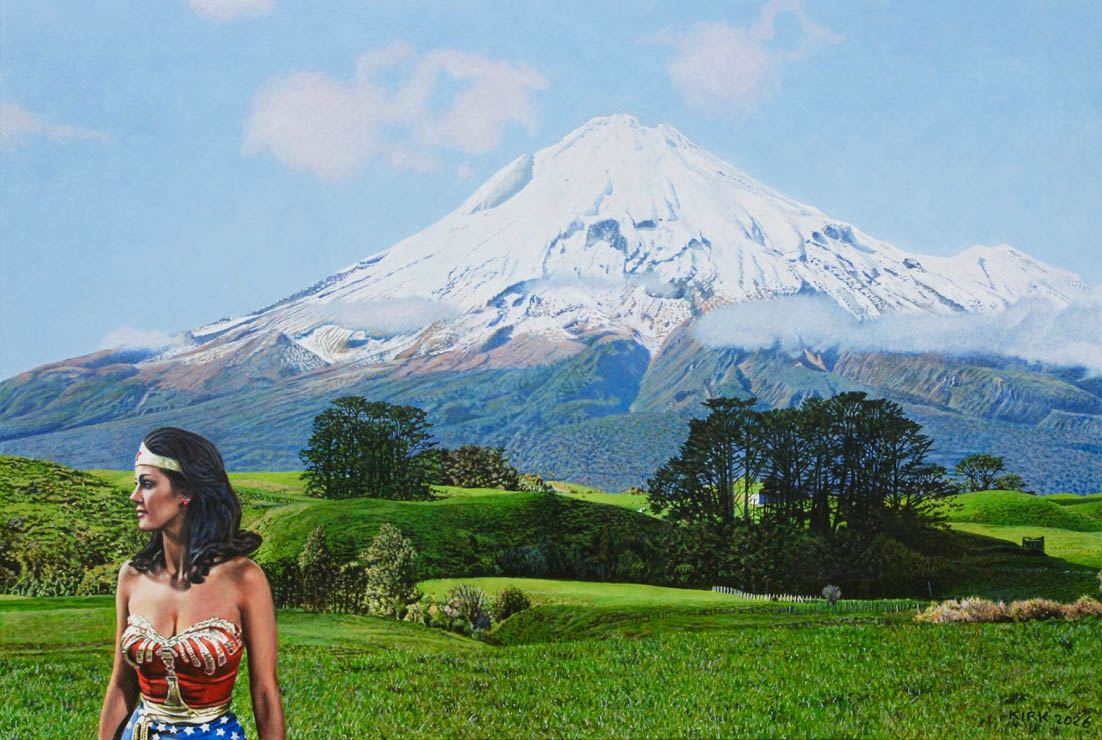 Wonderwoman and Mount Taranaki Graham Kirk, 2026 acrylic on board 985 x 1460mm email Graham at grahamdavidkirk@gmail.com