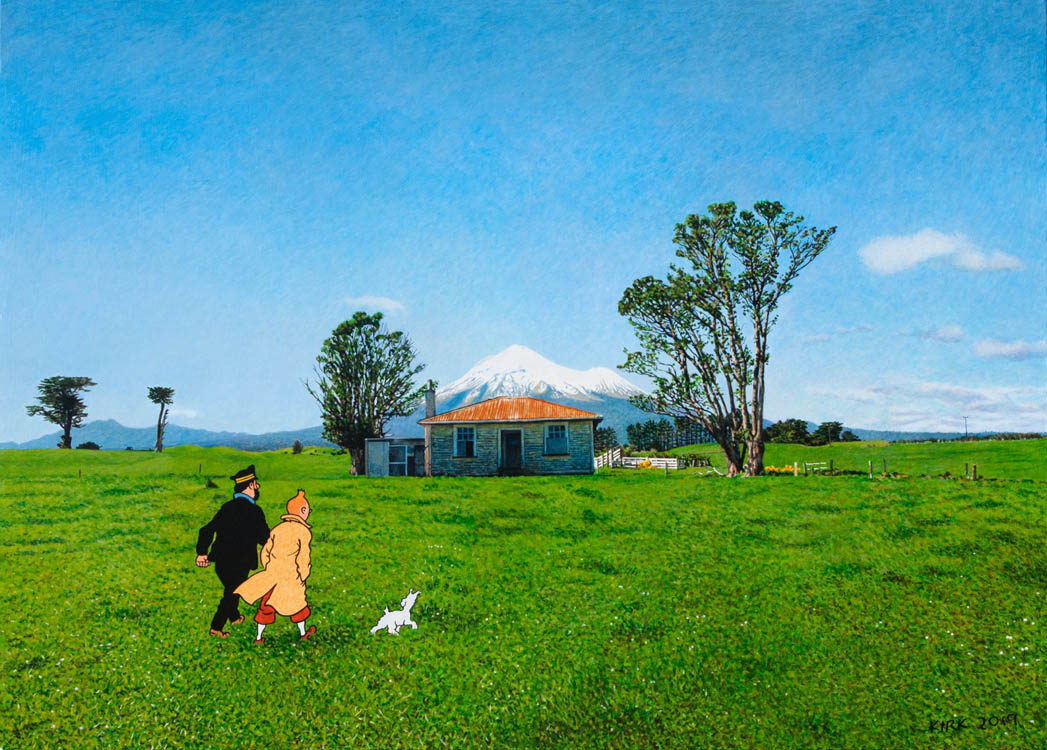 Tintin, Captain Haddock and Snowy in Wiremu Road