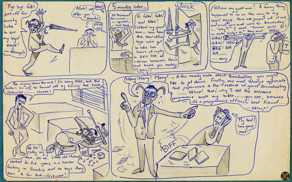 it wasn't long before I was drawing them myself. The comics that I grew up with in the late 50s and early 60s were Disney characters: Uncle Scrooge, Donald Duck and Huey, Dewey and Louie. I also remember Spooky, Richie Rich and the Phantom. I could see that the Phantom was well drawn, but for some reason never read it. Superman probably had the most appeal. I remember Tarzan. ![]() ![]() "Buttercup and Butch on Mars", 1959 ( 2 panels from page 7) . ![]() For years, our family (from the local bookshop in Hawera) subscribed to the Listener, the Weekly News, the Australasian Post, (Lion and the Beano for me) and my sister got Schoolfriend. I was aware of Tiger and Eagle, but for some reason settled on Lion. When Tintin first arrived in Hawera around 1960 I was 12. That was a revelation and a real influence. My first Tintin book was "King Ottaker's Sceptre". Apart from Tintin, I wasn't influenced by much else until the 70s when I discovered Robert Crumb, Wil Eisner (The Spirit), Richard Corben, Jean Girand (Moebius), Frank Miller (Barney Baxter), Raymond Briggs, Alex Raymond (a favourite) and Milton Caniff, who did "Steve Canyon". Regrettably, most of these titles only existed in comic book anthologies for me. They were before my time and were never seen in New Zealand anyway. Dick Sargeson probably owed something to these artists, particularly Alex Raymond, whose drawings and cinematic style I really admired. I guess I like my stories to be grounded in reality - essentially - but allowing for a bit of absurd fantasy and humour. There's not always a lot of humour in comics. My first job after leaving school was at our regional radio station 2XP New Plymouth. I was there for two years. A great job, I loved it, selecting music for airplay with a bunch of like minded characters. I couldn't resist making some strip cartoons of them, usually on the back of old programme schedules. ![]() ![]() Throughout the early seventies I was doing lots of black and white street photography in Auckland. After a shift back to Taranaki in 1980 I began looking at photography as a means of getting more realistic drawings for a new comic strip. Dick Sargeson began to take shape around 1983. |