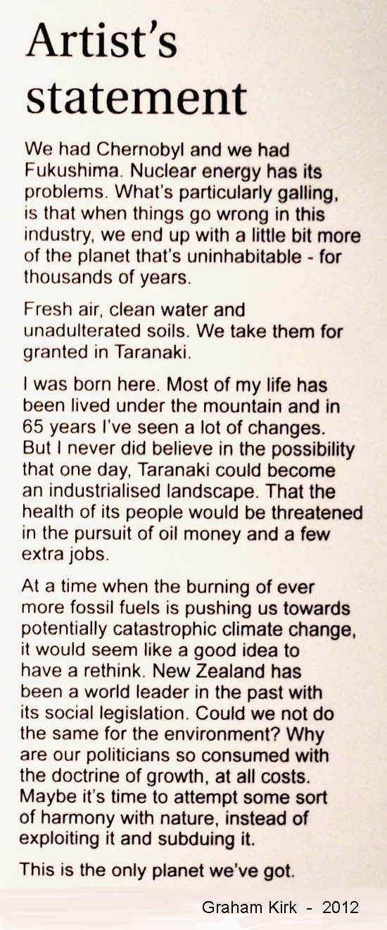 | 2012 | Organised and contributed to "FRACKED", an exhibition by Taranaki artists at the Village Gallery in Eltham. Click here to see Artist's Statement about Fracking at the time. |
