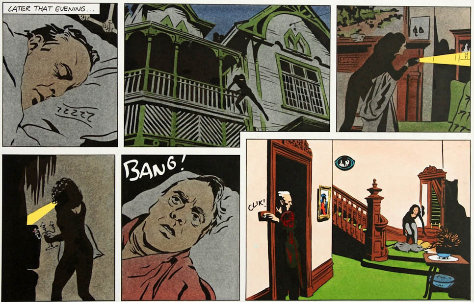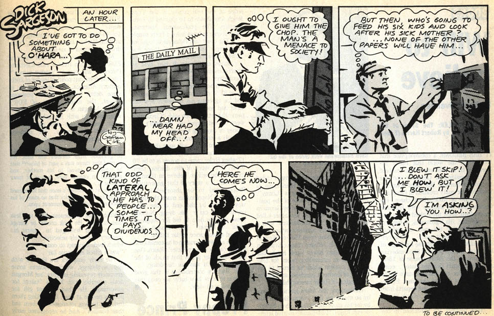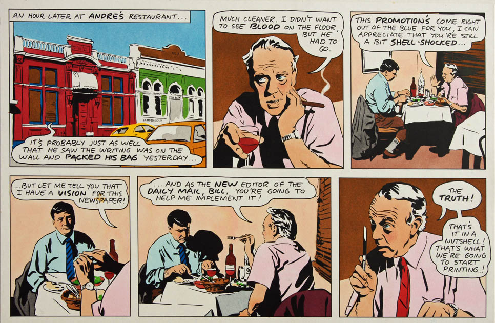 I had images that were easy to draw from, or not so easy. It was rare that we had to reshoot, as generally I was able to make do. Interior shots were always difficult using film. Unlike digital, which is really light-sensitive, film was very slow. Even using high speed film, it was difficult. There was quite a bit of inside shooting done for "Sir Jeremy", and I had to set up studio lights to get the job done. I remember an actor tripping on a cable sending a light stand crashing down, narrowly missing a valuable antique table. Using flash was a non-starter. Most shots were taken between 35 and 75 mm on a zoom lens, but I got more speed out of my 50 mm lens which had a 1.8 aperture. I always used black and white which I bought in bulk and loaded onto cassettes to keep costs down. I do feel that the photographic approach to producing "Dick Sargeson" worked well, although I'm sure there would be some purists out there who would disagree. Nowadays, I paint from photographs that I've taken, inserting elements and people into backgrounds to come up with something that for me, works. Again, I know that there will be those who disagree with this approach, for whatever reason. But I actually like taking photographs. You can take a bunch of images home and then decide what to do with them. I want to record the world as I see it now, and as other people see it, but with a twist. (A Kirk-quirk, if you like.) The reason I used letratone in the first instance was because it offered the best way of conveying tone on the printed page, and is synonymous with newspaper and magazine production. When I used it for the first time, it was quite a buzz to see the professional look it gave to the drawing. Almost as though it were already halfway to the publisher. It would be much easier today to do the Photoshop equivalent, but back then I really liked it, even though it was expensive to use and required lots of exact cutting. I did try cross-hatching as an experiment, producing the same image by both methods, but letratone won out. |