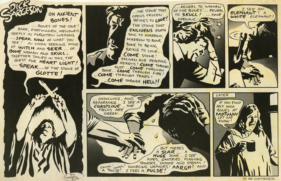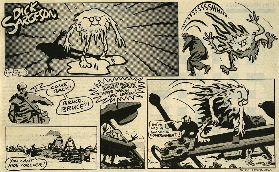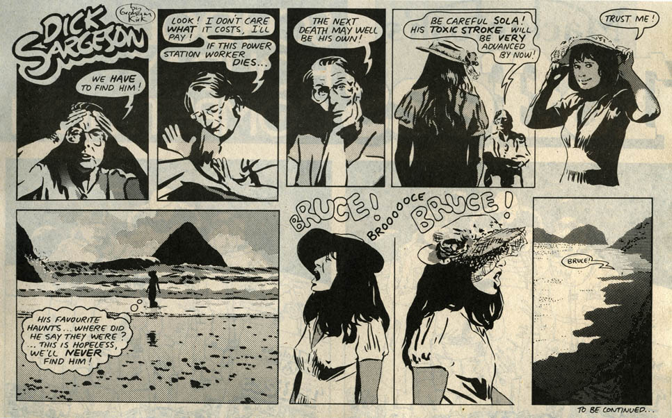 which only becomes evident as the story progresses - makes this programme special. I'm hanging out to see it rescreened. Lou Grant (with Ed Asner in the role), about an American newspaper editor, was also really good. In terms of New Zealand comic artists, I met Colin Wilson in Auckland in the late 70s. He showed me his work at the place where he was living in Ponsonby. He was a great admirer of "Lieutenant Blueberry", who, he said, was a great influence on his own personal style. Colin introduced me to "Strips", a sort of underground magazine printed by Colin and friends, showcasing the work of NZ comic artists (most of whom I never knew about). I showed him some of my early Dick Sargeson stuff. I don't know what he thought. He probably didn't approve of me working from photos. Colin was a real talent, (even if some of his stories were a tad depressing for me) and I believe he now works for one of the major comic agencies in the US. I wasn't in contact with any other NZ comic artists at the time. I received no feedback from the NZ comics community. In more recent times, Tim Bollinger has shown some interest and Steve Braunias has always been supportive, being the first reviewer to review "Dick Sargeson". In the Sunday Times, I think it was. The Dioxin Man strip was a response to the Ivan Watkins Dow chemical company in New Plymouth leaking herbicides into the sea from their plant behind the port. I was walking in that area with Michael Smither (we worked together on a beach reclamation scheme in New Plymouth in the early 80s), and we discovered rock pools with no marine life and a nasty smell. Surfers were complaining of rashes. I thought it was bloody outrageous, and the idea of a comic strip about a creature created by this "stuff" came fairly quickly. The environmental issues were prime reasons for the strip, particularly with "Dioxin Man". I had some dealings with Greenpeace in Taranaki at that time, mostly seeking information and talking to a Scandinavian activist who was a biochemist and was able to simplify for me what was going on at IWD, particularly with regard to herbicides, 245T in particular. I had a sense that the Listener was getting a bit edgy at the time that episode 43 of "Dioxin Man" went to print and I was keen to ensure that the "newscast" was an accurate reflection of what was going on in New Plymouth with IWD. The Health Department were totally ineffectual. Witness the cases of cancer that have emerged around Paritutu since. My own father worked for about a year at IWD as a handyman. I believe that it contributed to his early death from a stroke at the age of 64. I was told by a close friend who knew someone who worked at the plant that IWD had a file on me. It made me feel like Dick Sargeson... |