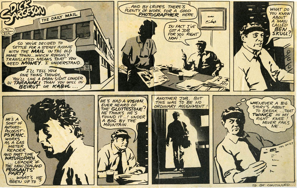 since we married. She has a great eye and is doing her own art now. The other Dick Sargeson story, "The Stone of Glotte", was more to do with an ancient "power object", offering a lot, but not delivering very much. Jeremy Hodgekiss was definitely the "star" in this one. I may have been unconsciously writing Dick out of the picture by this time. I think that Sir Jeremy, as a man with lots of money but no morals, is a great character to be confronted by the Glottestone. Unlike Lurgan, he's not interested in the magical power that Ben Skull says it possesses. It's an inconvenience that's thwarting his attempts to lay waste to fifty acres of native forest on the bushline of the mountain, so that he can build "Boomerland". There was an earlier version of Dick Sargeson in the late 70s. It only ran to four pages and was set in Auckland where I was living at the time. I was halfway through this when I found that I needed to photograph real people (my friends, usually) to play the various roles. I used letratone for the first time, and the last page was done in colour. Colour seemed to be the way to go. I was optimistically thinking about publication, and so I had to begin again with a new story which I called "The Stony River Affair". (Very Tintin.) I got several pages into this (Dick sees a flying saucer while taking photos on the Stony...) when I learnt about Ivan Watkins Dow's misdeeds down at the port, and decided a new story was required: "Dioxin Man". This was to be done in a freehand style but with reference to 35 mm contact sheets to assist in drawing the various locations. I'd done about three pages in this style, which I rather enjoyed, when the call went out in the "Listener" for a new cartoonist. I took both stories and styles down to Wellington to see what they liked best. They liked the realistic style, but they also liked the Dioxin Man character. Tom Scott and Burton Silver's opinions were sought by the "Listener" management and in the end an amalgam of "Dick Sargeson" and "Dioxin Man" ensued. I have to say it was a bold decision by the "Listener" (David Beatson in particular) to take me on. I'd never done a comic before that went further than about four pages. David Beatson was very supportive of the strip. Somebody once said that he was a "closet comic strip artist" himself, but I've had no confirmation of that. He did say that the comic had a "cult following" which was reassuring. I got a sense that he enjoyed the politics of the story, especially the "we've had a change of government" episode where Dick appeals to Dioxin Man, disappearing into the sea. |